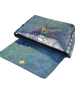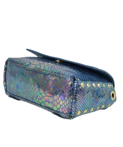 La borsa Miki Nagini è realizzata in pelle laminata boreale e stampata effetto pitone.