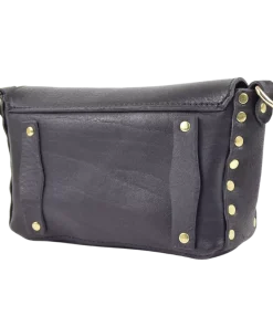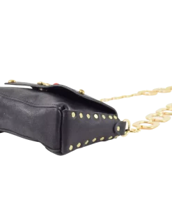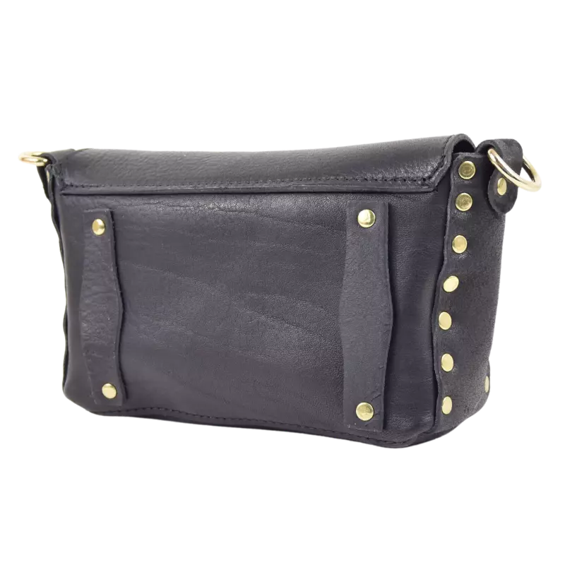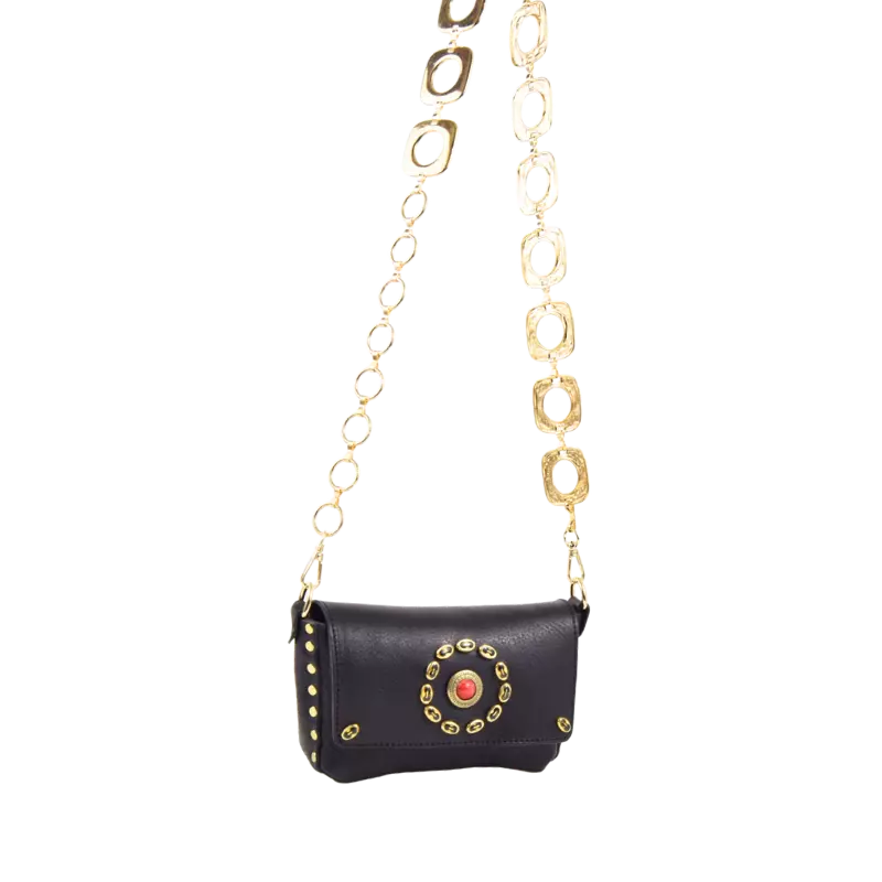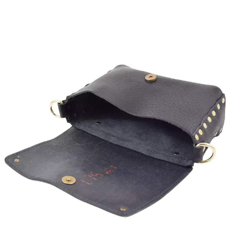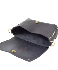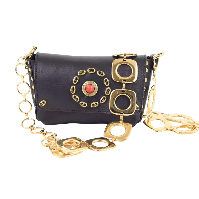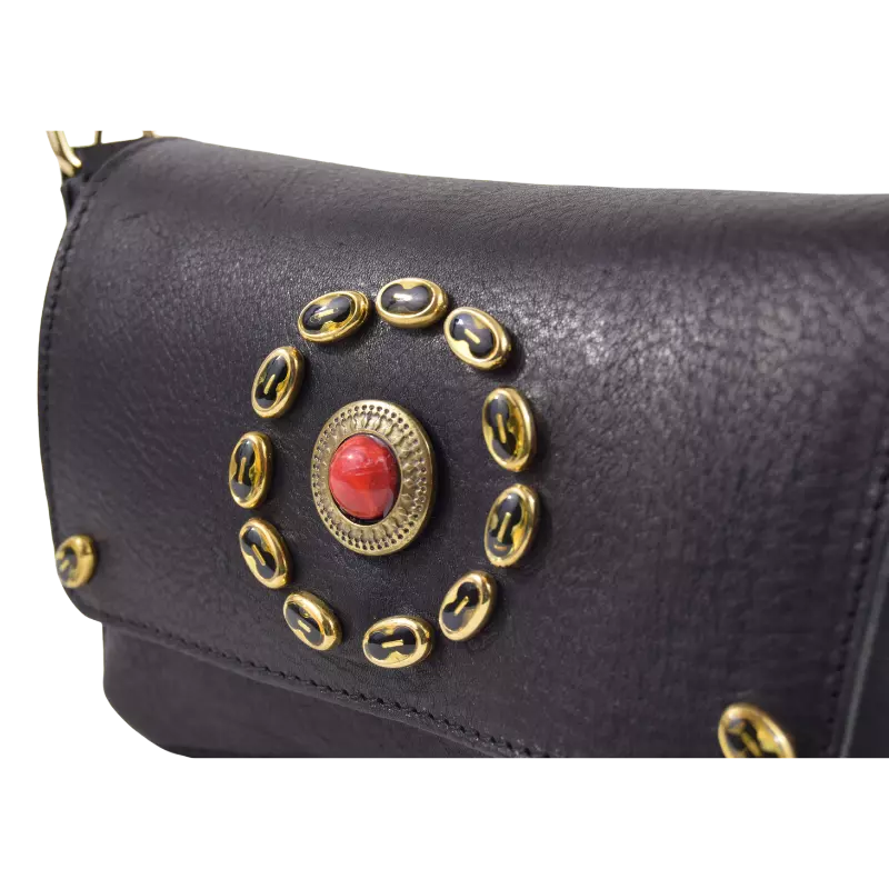La borsa Miki Fiamma è realizzata in cuoio vacchetta nera tinta in botte e borchiata a mano con borchie verniciate in nero e una simil pietra corallo centrale.