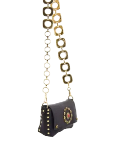 Le dimensioni sono 18x11x5cm, la tracolla, rimovibile, è realizzata in stile catena color oro e sagome geometriche.