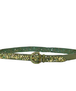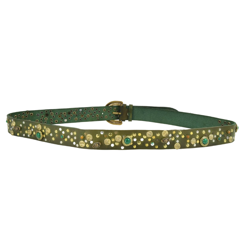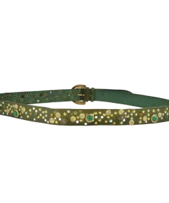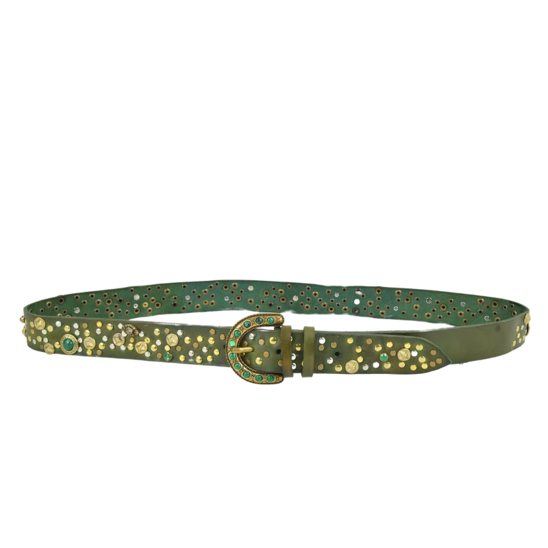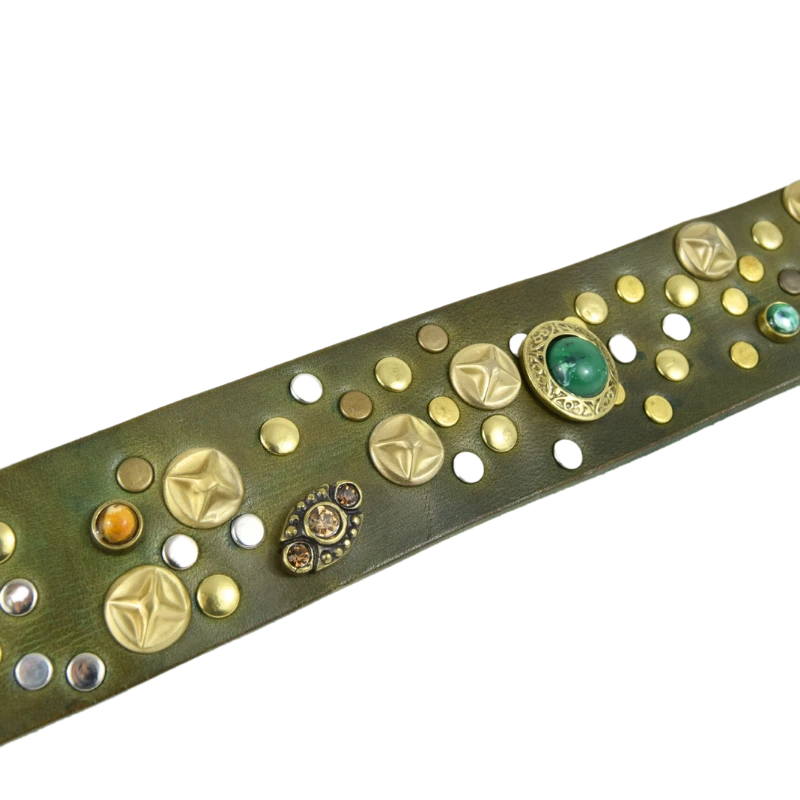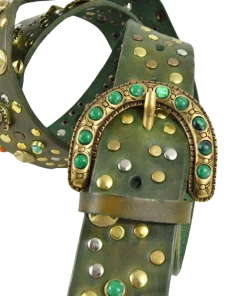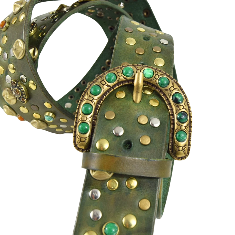 Altezza 4cm. Fibbia in zamak galvanica ottone con simil pietre verdi. Borchiata interamente a mano con rivetti semplici e borchie lavorate con simil pietre colorate e strass.