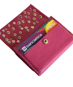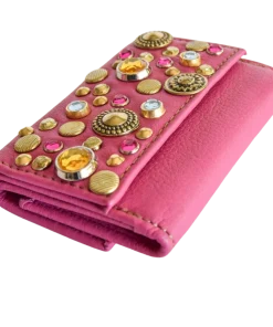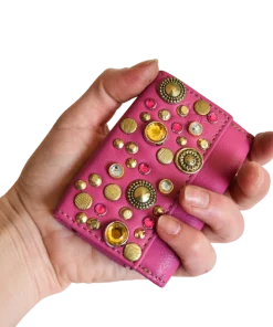 Portafoglio realizzato con un pellame morbido color fucsia, borchiato a mano con borchie di varie forme, grandezze e galvaniche ed è impreziosito da cristalli lucenti nei colori del giallo, rosa e azzurro.