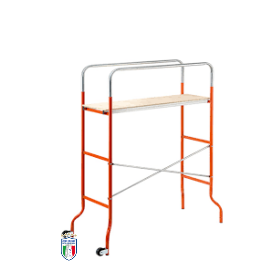 Struttura tubolare in acciaio verniciato, dotato di pianale di calpestio in legno multistrato e di due ruote.